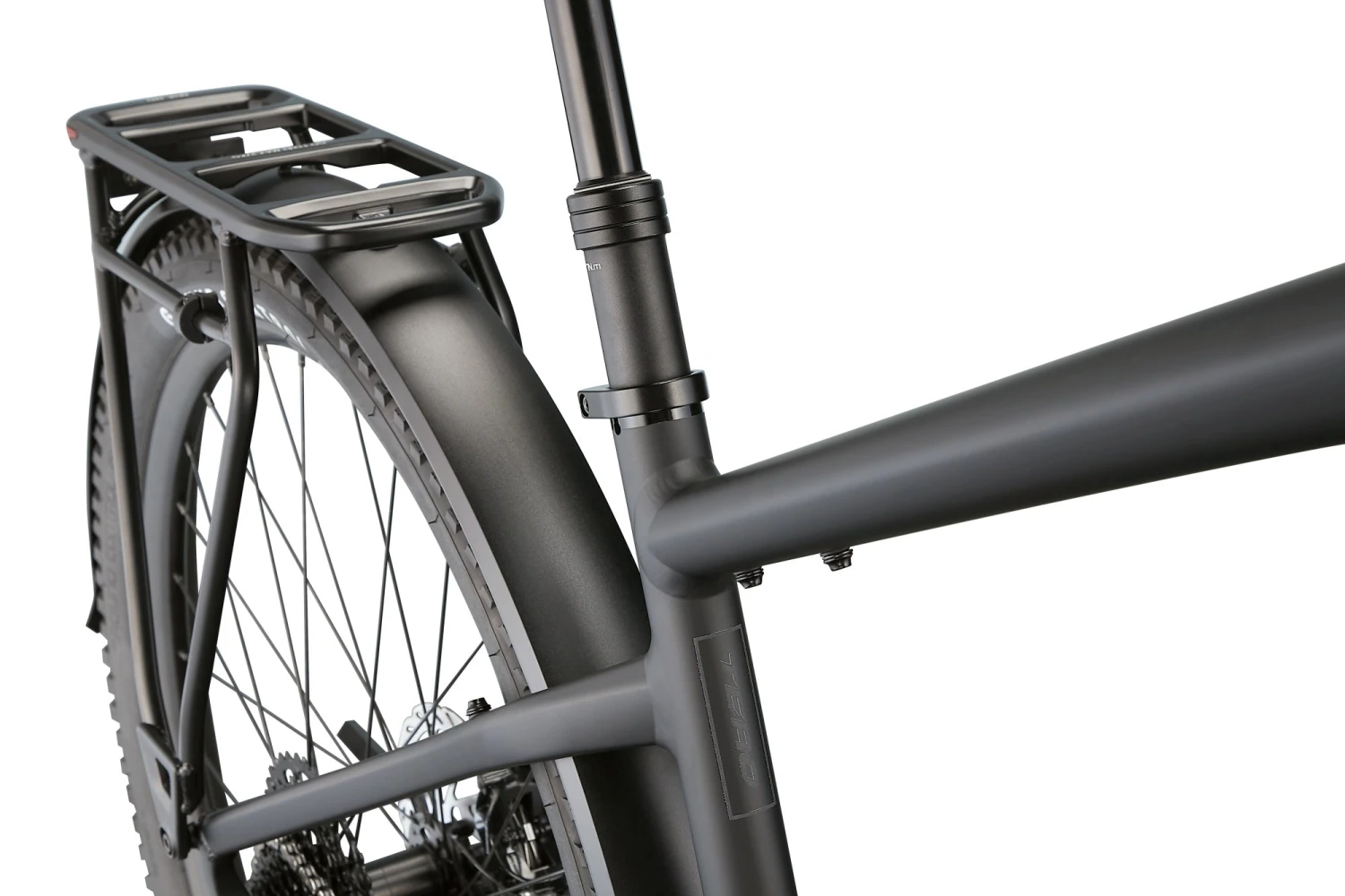Varustettu DRYTECH lokasuojilla, LED-etu- ja takavaloilla sekä 27 kg:n kapasiteetin takatelineellä. Tarakka on yhteensopiva lasten istuinten kanssa, ja pyörä on mitoitettu vetämään myös perävaunua.